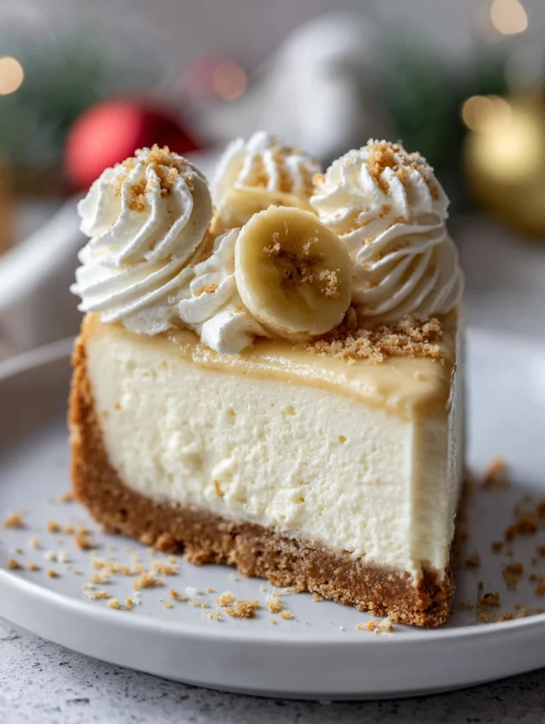 6. Before serving, garnish the banana cream cheesecake with whipped cream and sliced bananas for an extra touch of decadence.