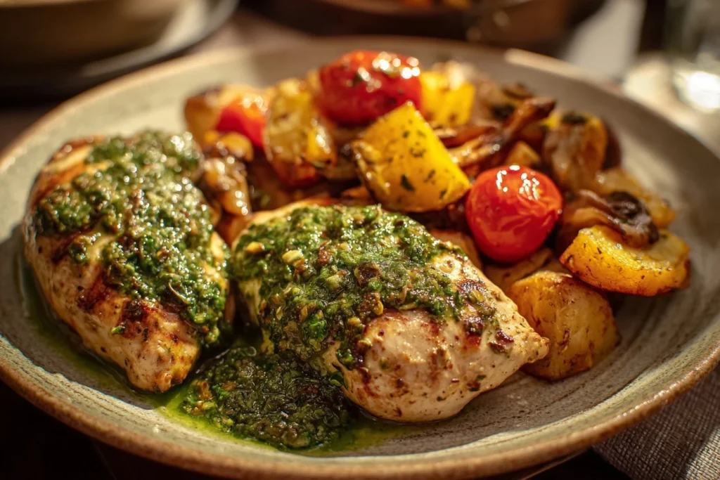 What sets this pesto chicken meal apart is its perfect blend of flavors and textures. The crispy exterior of the chicken pairs beautifully with the tender roasted vegetables, creating a delightful contrast that keeps every bite interesting. Whether you’re a fan of bold Mediterranean flavors or simply looking for a satisfying and wholesome meal, this dish ticks all the boxes.